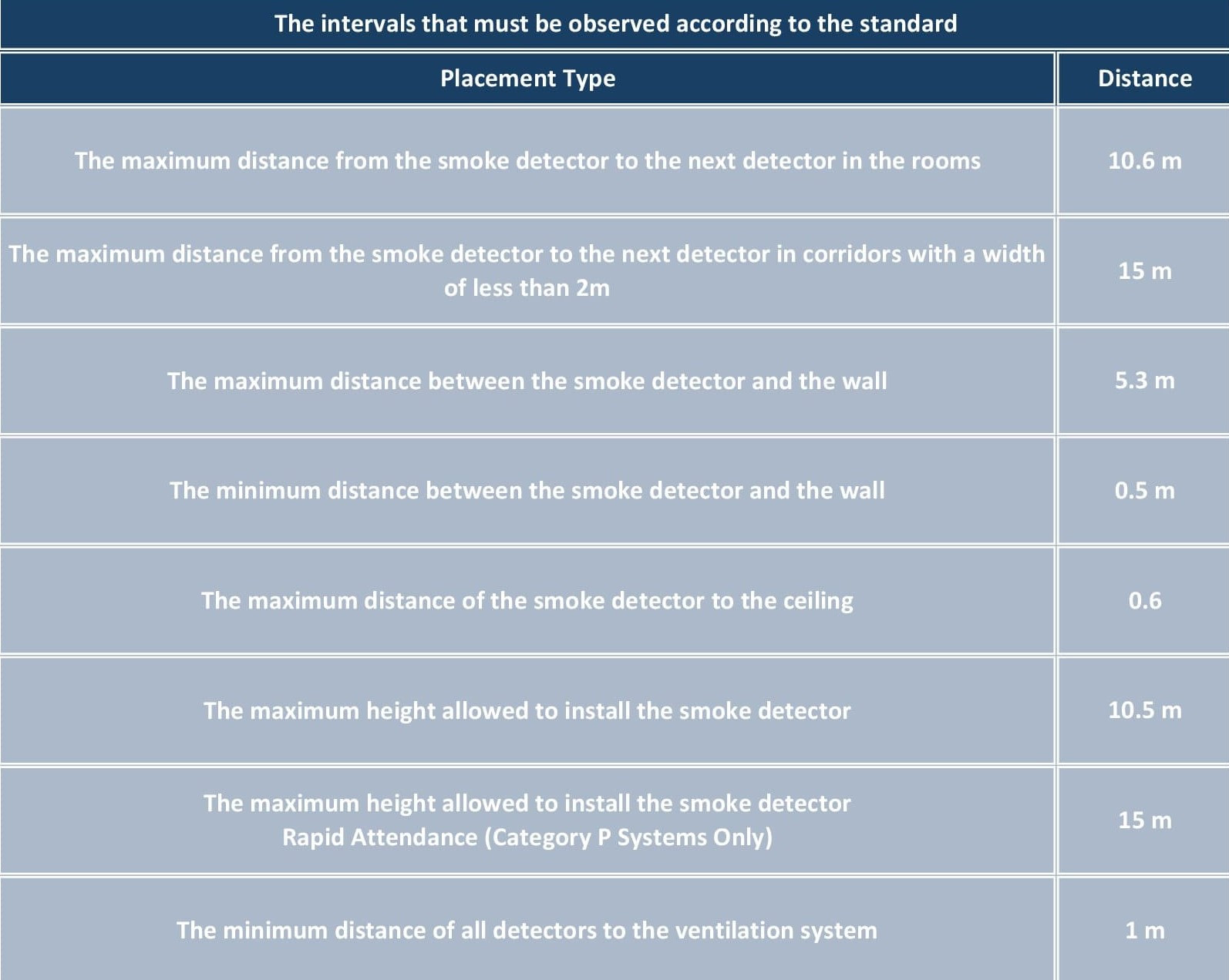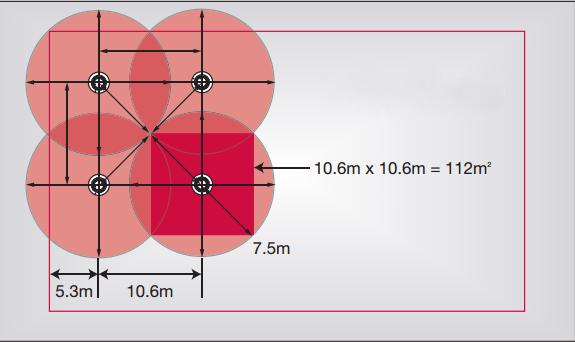 Smoke detectors cover a radius of 7.5 meters, but their placement should be such that no area falls within their blind spot.