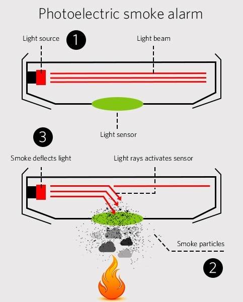 Smoke detectors detect tiny particles of smoke produced by a fire that are too small to be seen by the naked eye.